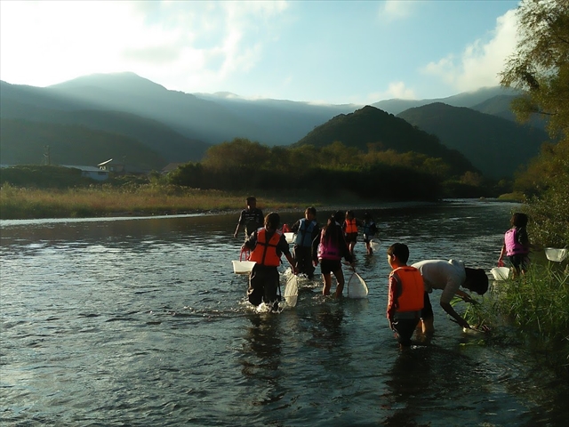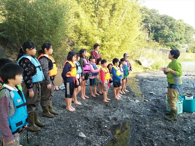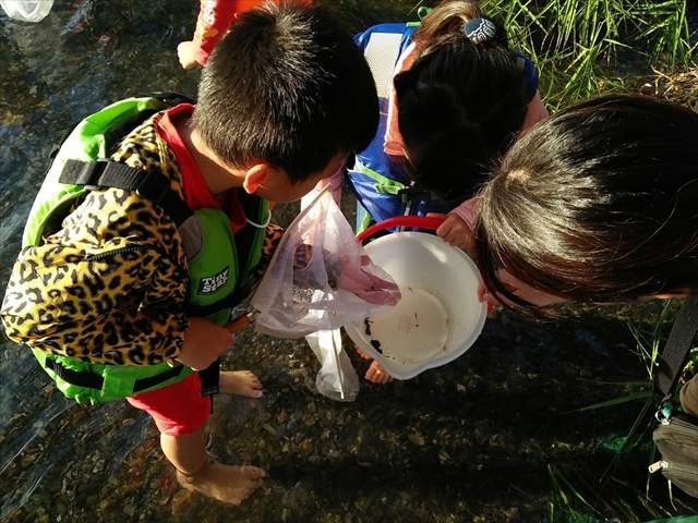 河川生物研究者の石川先生のサポートにより、みんなで川の生き物を探しました。いろいろな生き物が子どもたちの手で次々とバケツへ。働き者の調査隊員たちです!