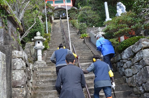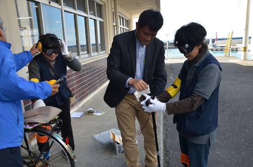 室戸市社会福祉協議会さんから、高齢者疑似体験セットをお借りして、「港の上ツアー」開催中の地震時を想定。