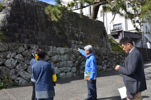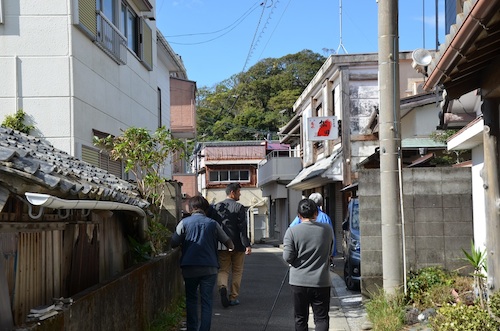 避難所までのルートが適切か、そもそも避難所への入り口が瓦の落下などで通れなくなるのではないか、溝に蓋が欲しい、など防災の話とともに、普段のツアー時に高齢者のお客さんに配慮した伝え方や行動、道具のあり方などについても意見が飛び交いました。スタート地点に戻る時にも、せまい道を歩きながら「ここの塀、くずれたら通れないかもしれないね」など、たった1時間半でしたが防災の視点が芽生えていました。