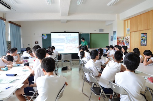 「ジオパークって聞いたことありますか?」から始まった、ミニ講座。手をあげたのはクラスに1人?2人?、、、まだまだジオパークは知られてないようです、、、。