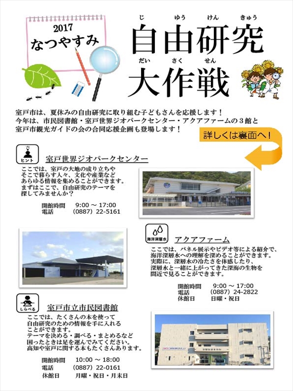※自由研究大作戦は、室戸ユネスコ世界ジオパークの共催事業です。