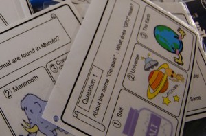 クイズは前もって英語で作った、3択とか4択の問題。室戸ジオパークに関する問題です。これをラミネートして、遊歩道沿いの説明看板に結び付けておきました。