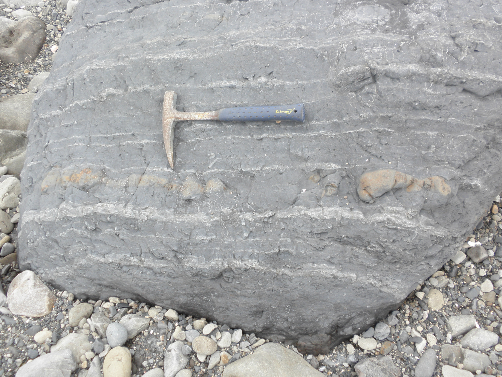 ①ある地層面にそって鉄丸石が分布。