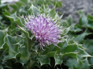 アズです。先日、室戸岬のみくろどの前の道路際で、ハマアザミの花(紫色)が咲いているのを発見。