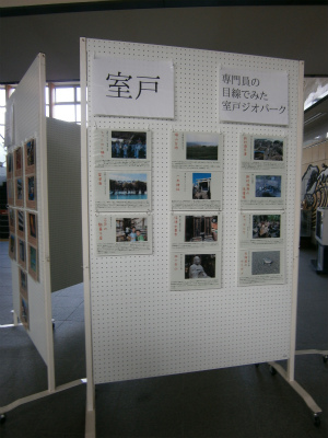 トークショーでのお話、ジオツアーの案内をしていただいた前田博史さんの室戸ジオパークで撮影された写真展示コーナーをはじめとして、ジオパーク(JGNメンバー)のポスター紹介&パンフレット配布、学術協力をいただいているJAMSTECの研究内容紹介コーナー、実験コーナー、そして、室戸市を構成する5ヵ町村(羽根・吉良川・室戸・室戸岬・佐喜浜)の様々な見どころを紹介したパネル展示コーナーなどなど様々な展示を行いました。
