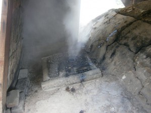 窯の中が原木でいっぱいなると、乾燥の工程に移ります。窯くべ後、原木を1日窯の中で寝かした後に、窯に点火します。すると窯の上部にある穴からは、多くの水蒸気が出てきます。これは木から出る煙ではなく、水分が蒸発したことによって生まれる水蒸気です。最終的に木の直径は、3分の1程度にまで小さくなり、重さは10分の1くらいにまでなります
