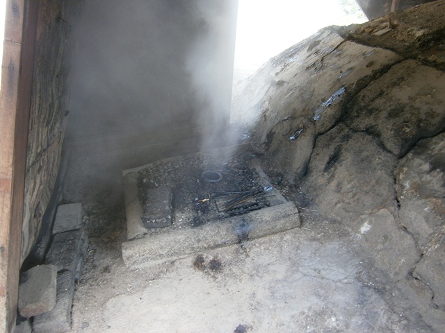 それらの原木は、窯の上方側面に空いている計8個の穴(バイ)から、すきまを埋めるように重ねながら入れらます。適当に投げ入れるのではなく、窯の中で乾燥のために必要な気流が生まれるようにきちんと計算されています。そのため、窯の中の原木はきれいに整列されています。
