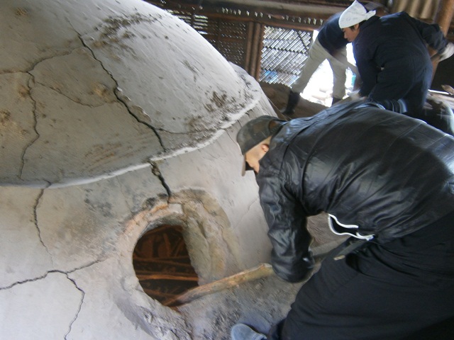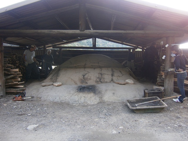 すべての原木を入れ終わるまでに、約4時間かかると言います。窯付近の温度は非常に高く、時には風の流れで顔や体に高温の熱風がふきかかります。窯の周りで10分も作業をすると、冬でも汗が噴き出ていました。みなさん原木をひょいひょい持ち上げて次々と木をくべていましたが、実際に持ってみると非常に思いです。熱さだけでなく、足腰も丈夫でないといけません。黒岩さん(息子さん)によると「使う筋肉が違う」ということです。夏の作業は本当に体力が勝負になってくるそうです。