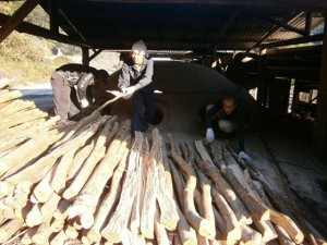 原木には、樫やうばめ樫が使われます。山で伐採されたものですが、今では買ってくる場合もあるらしいです。