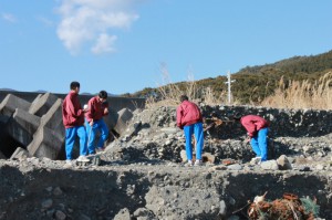 野外での授業は開放的なのか、みんな海岸に落ちているいろんなものに興味津々。「特徴のある岩石を拾ってきて!」と言っても、落ちている瓦やらヤシの実やらを持ってきてくれます。いろんなことに興味津々なのは、とても良いことです。