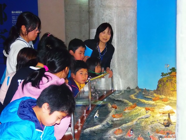昔、室戸の人は鯨捕して生活を形成していた。その様子を資料館のお姉さん(久保さん)が紹介しました。みんな真剣に聞いていました。
