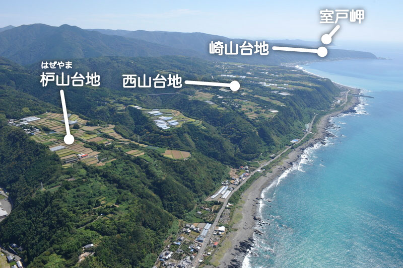 空から室戸を見ると、こんな感じです。羽田から高知空港行きの飛行機からも、右の窓側席に座っていれば、見る事ができます。不思議な景色でしょう??平らな山の上に農地があって、海から立ち上がる急な崖!