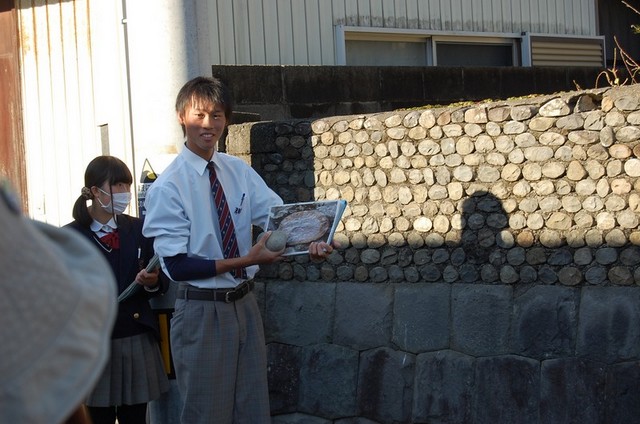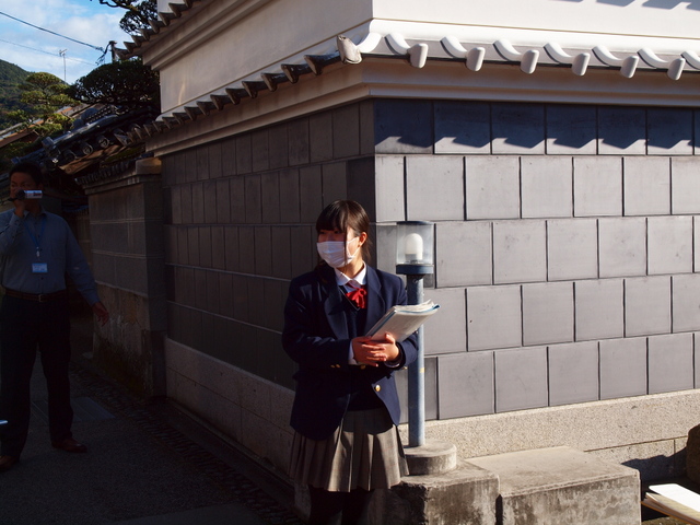 西山台地の次は、古い町並みです。西山台地は、隆起した土地で農業が行われている場所ですが、吉良川町の古い町並みは、隆起した土地で人が暮らしている場所です。下の写真の彼女は、緊張して前日はほとんど寝れなかったとか。それでも、白壁、水切り瓦、石垣(いしぐろ)など吉良川の建築の特徴を的確に紹介してくれました。