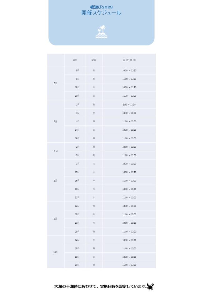 潮の満ち引きを踏まえて、開催日時を設定しています。下記実施スケジュールをご確認ください。