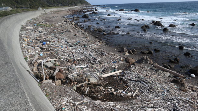 丸山海岸は最近の嵐で流れ着いたのか、流木と共に大量のゴミが打ち寄せられていました。