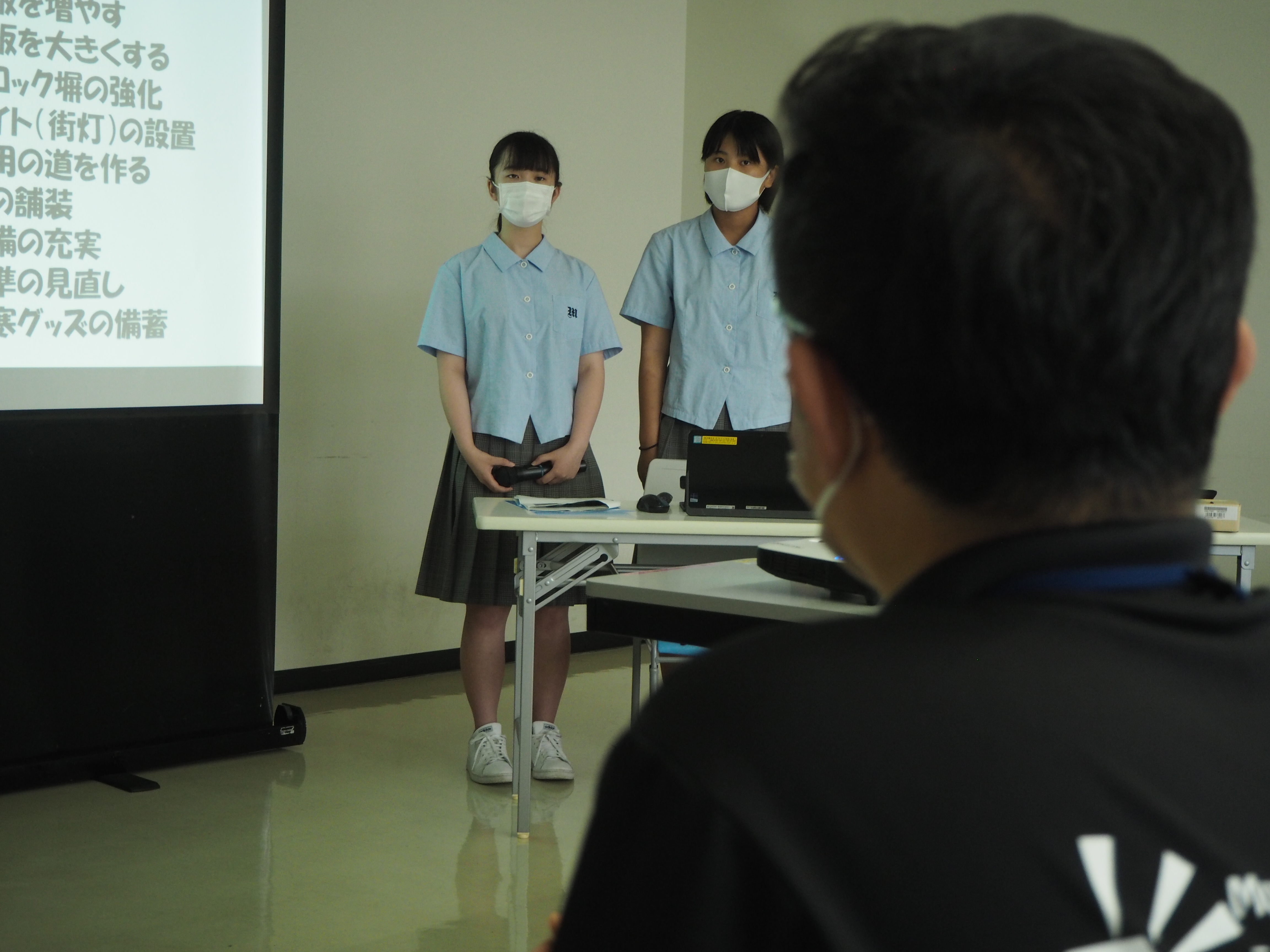 生徒はキラメッセ室戸で遊んでいる時に発生する地震を想定し、キラメッセ室戸から各周辺避難所までの距離と避難までにかかる時間を計算。さらに地震後の津波の発生を考えて津波の到達時間を計算し、数学を利用した効果的な防災を研究しました。数学を使って割り出したデータをもとに実際の避難を体験。報告会では公民館などの避難所や津波避難タワーなどに避難してみて感じたことや、課題を発表しました。